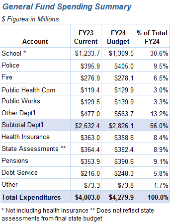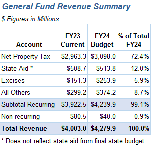The City of Boston’s FY24 General Fund budget strengthens basic, essential city services and operations—investing in education, public safety, and infrastructure. The $4.3B budget is $276.9M, or 6.9%, more than the FY23 budget, driven by projected increases in revenue from property and excise taxes.